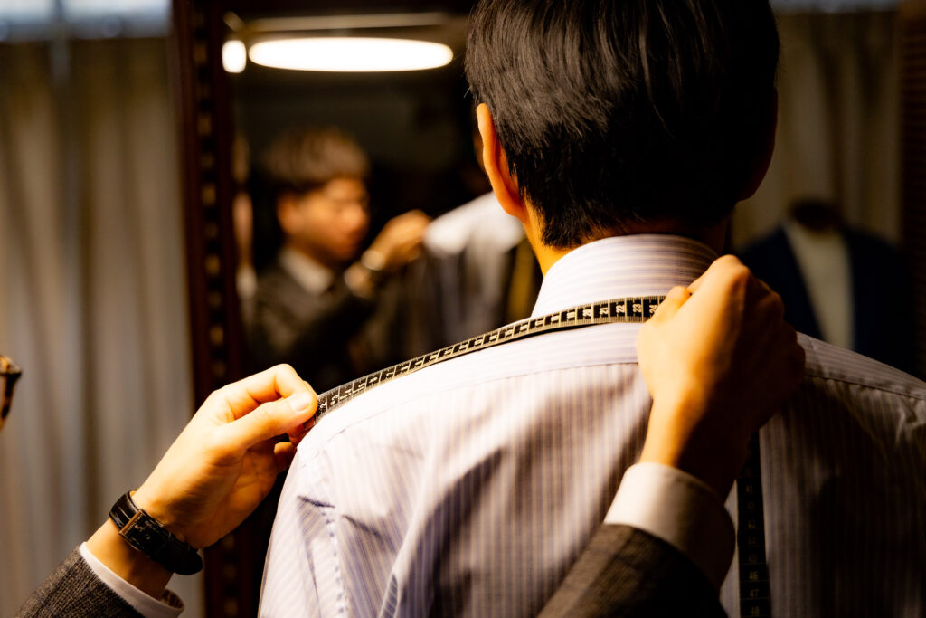 お客様の体型を計測します。また、サンプルを試着(シャツをご注文の場合、試着はございません)し各所のバランスを確認いたします。