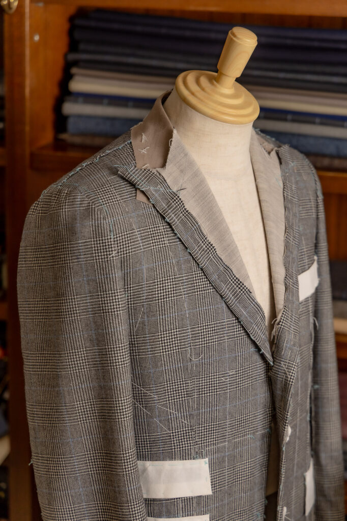 仮縫い段階のスーツを試着し、フィット感やシルエットを細かく調整します。状況によって再度フィッティング(中縫い)を行いより細かく調整していくこともございます。